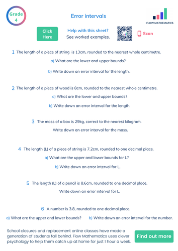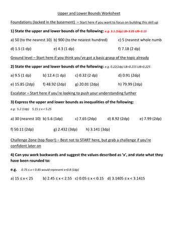 Bounds and error intervals worksheet | KS3-4 maths |Teachit A KS3-4 maths worksheet on finding upper and lower bounds and stating the error interval using integers, dp and sf. A step-by-step guide is given.